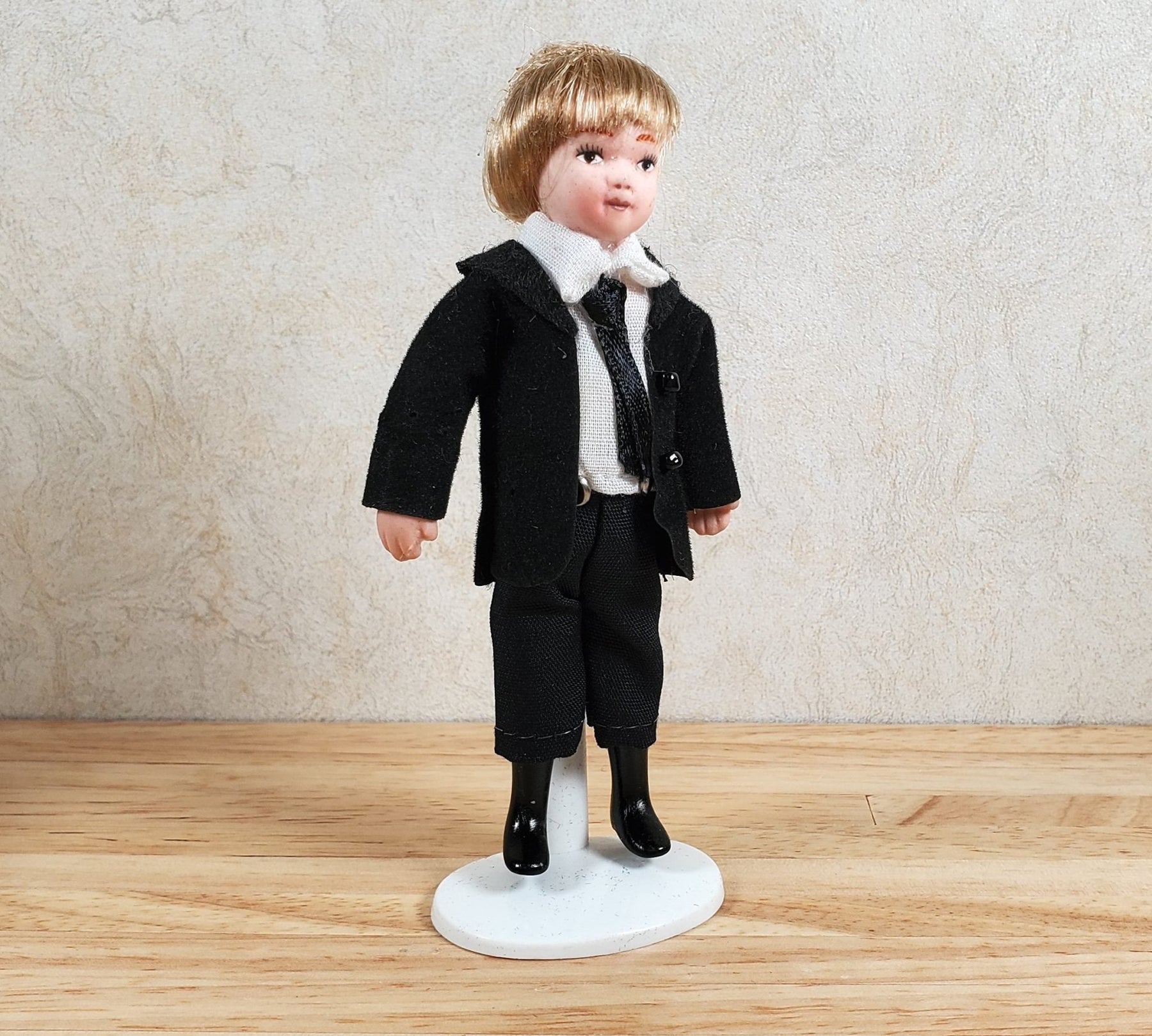Dollhouse Boy in Black Suit & Tie Son Doll Porcelain Semi-Poseable 1:12 Scale