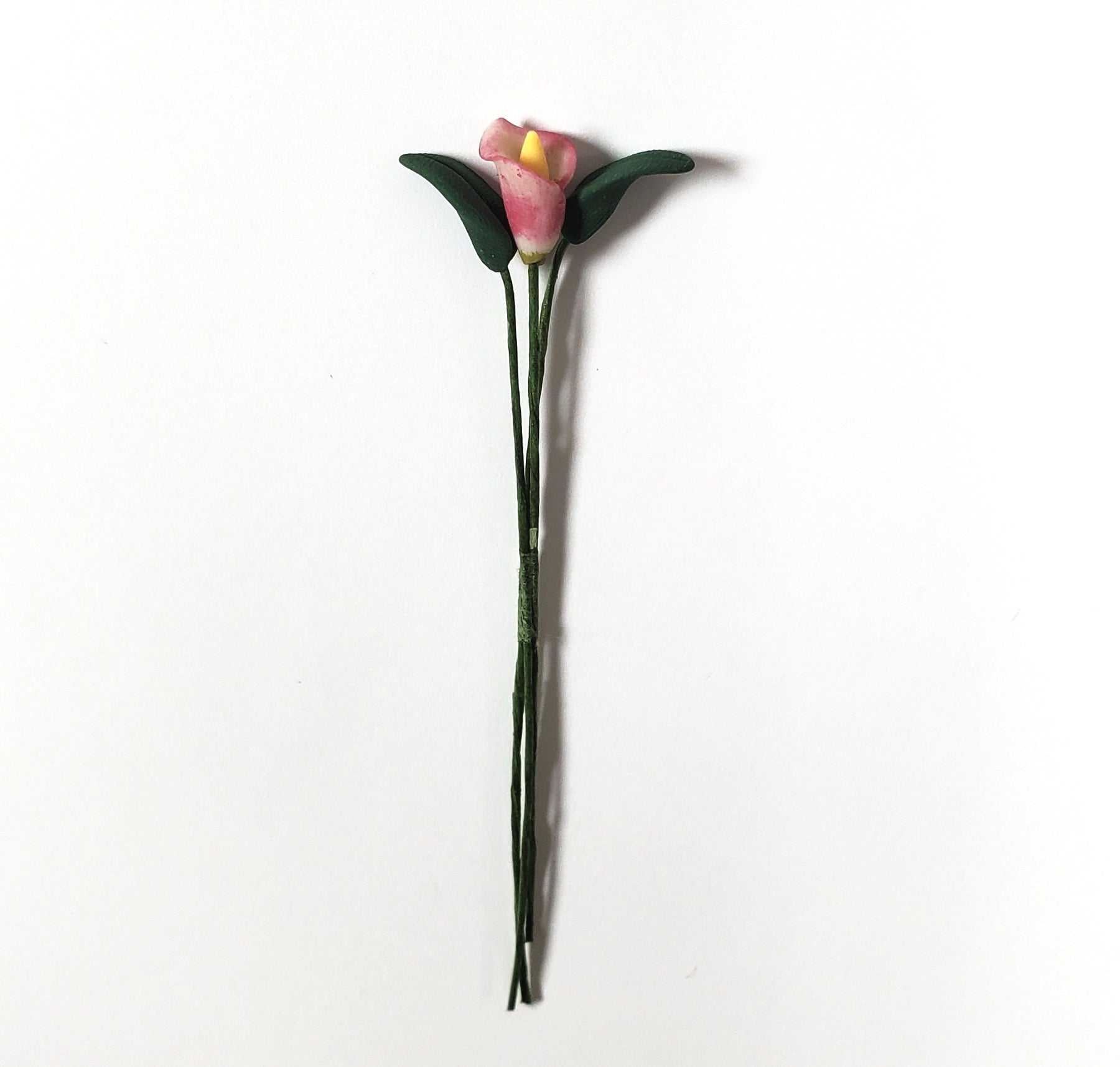 1:12 Scale Dollhouse Miniature single, extra long stem of a pink Calla Lily with leaves. (wire stem is posable)