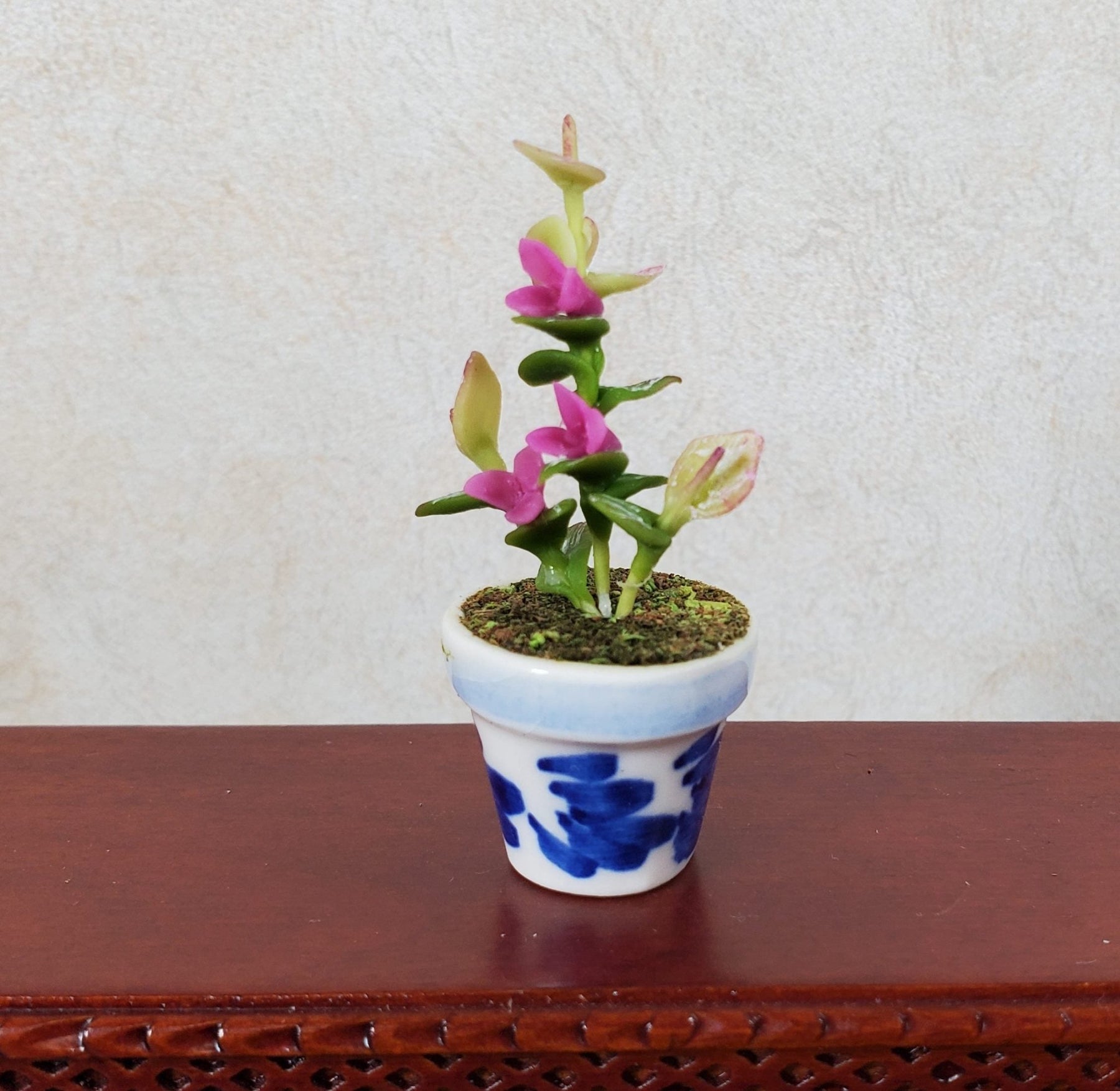 1:12 Scale Dollhouse Miniature Potted Plant w/ Pink Flowers in Blue & White Ceramic Pot
