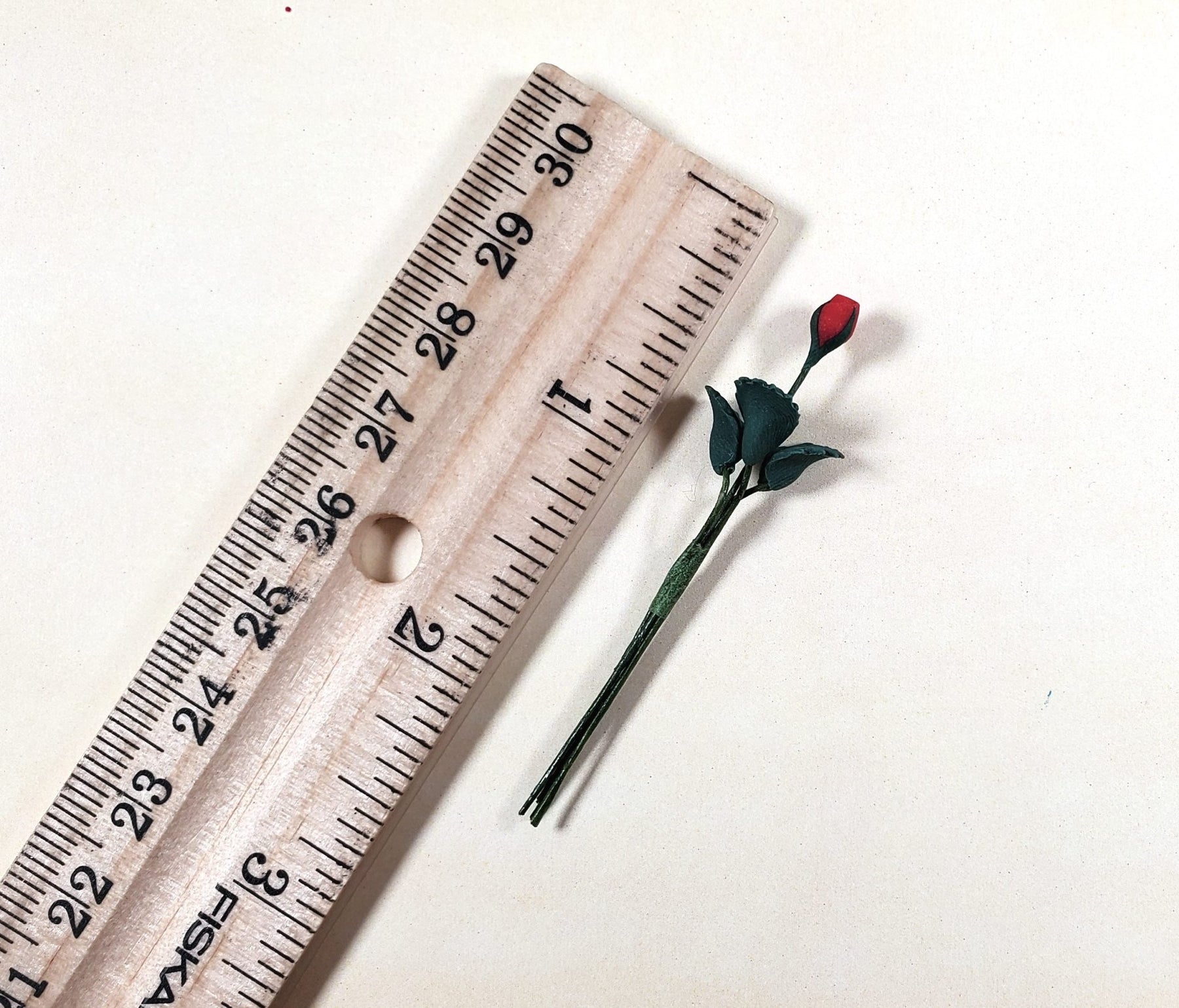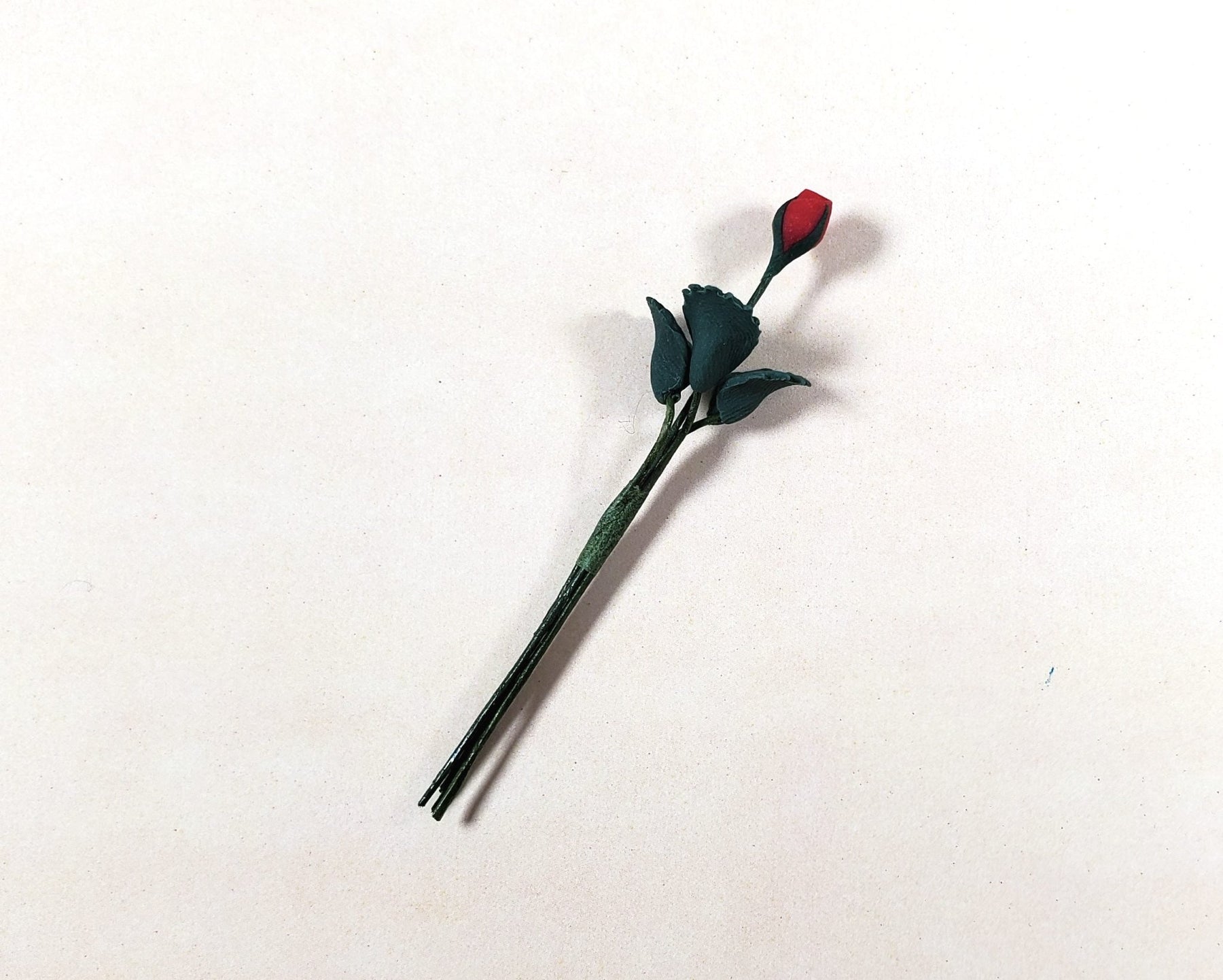 1:12 Scale Dollhouse Miniature single stem of a red Rose bud with leaves. (wire stem is posable)