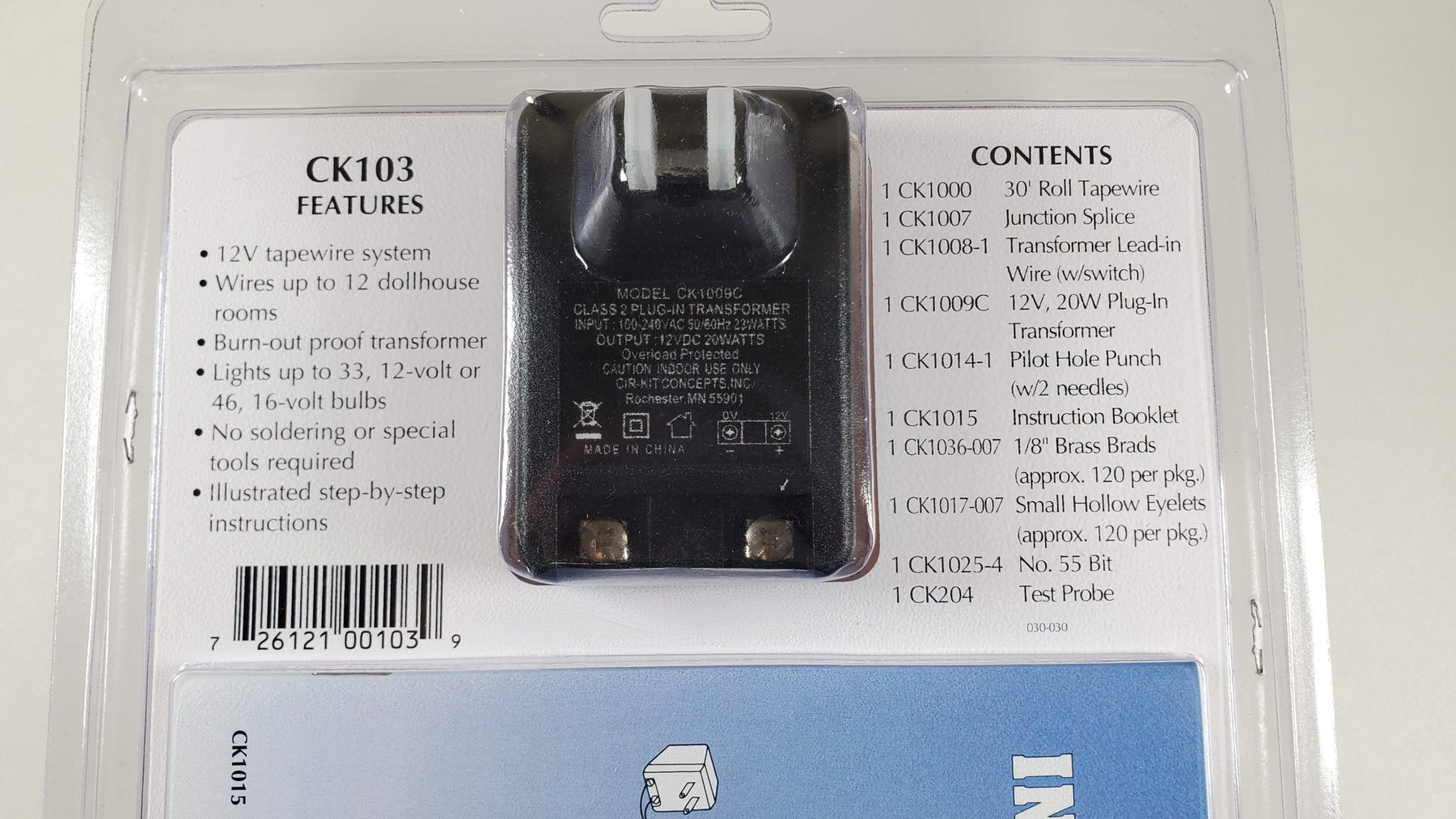Our popular CK103 kit has all the basic Starter Kit items plus a double quantity of tapewire, eyelets and brads. These added items will easily allow the wiring of a 10 to 12-room dollhouse. A special circuit-breaker protected 20-watt transformer is included to provide power for up to 33 12-volt or 46 16-volt GOW bulbs. An in-line power switch provides on/off light control without the need of disconnecting the lead-in wire from the dollhouse.