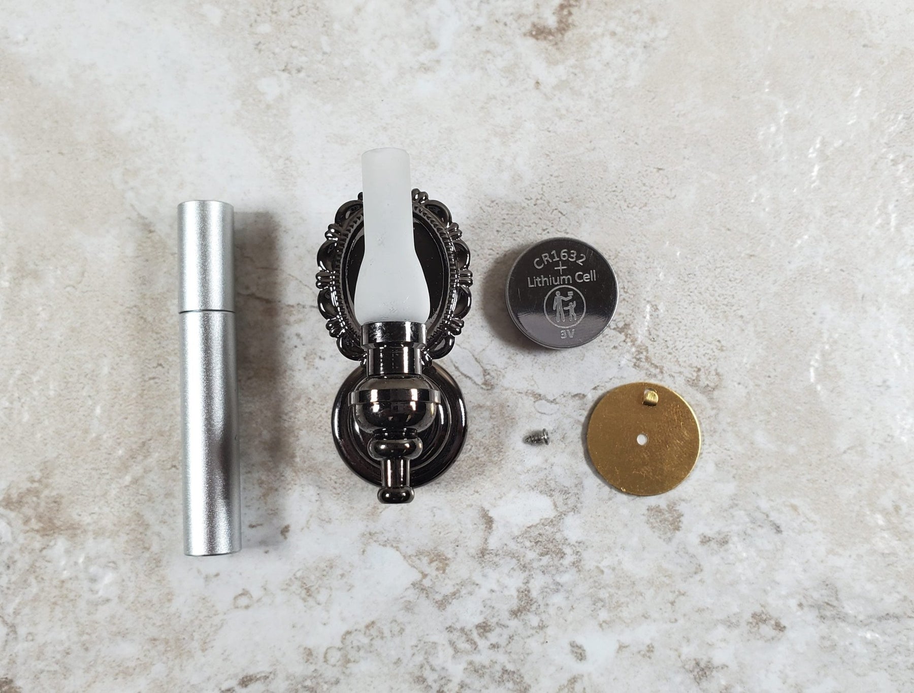 Large black chrome sconce with reflective back piece, includes a replaceable CR1632 battery, hanging disk, magnetic wand and optional screw for help with hanging