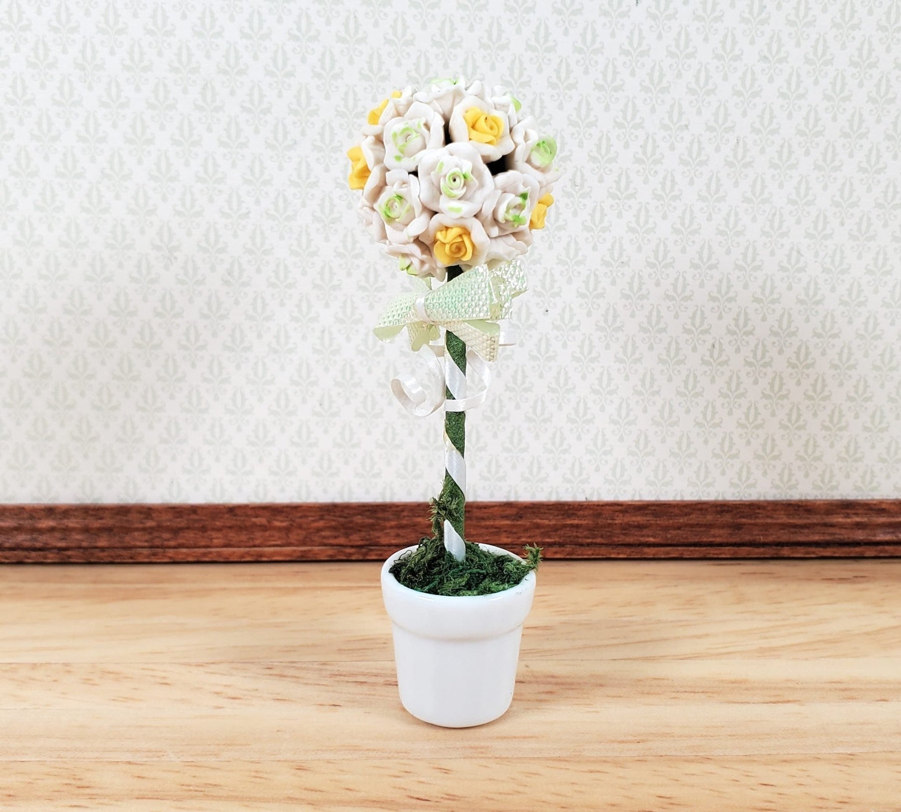 Dollhouse White Rose Wedding Topiary in a White Ceramic Pot 1:12 Scale Miniature - MiniatureCrush