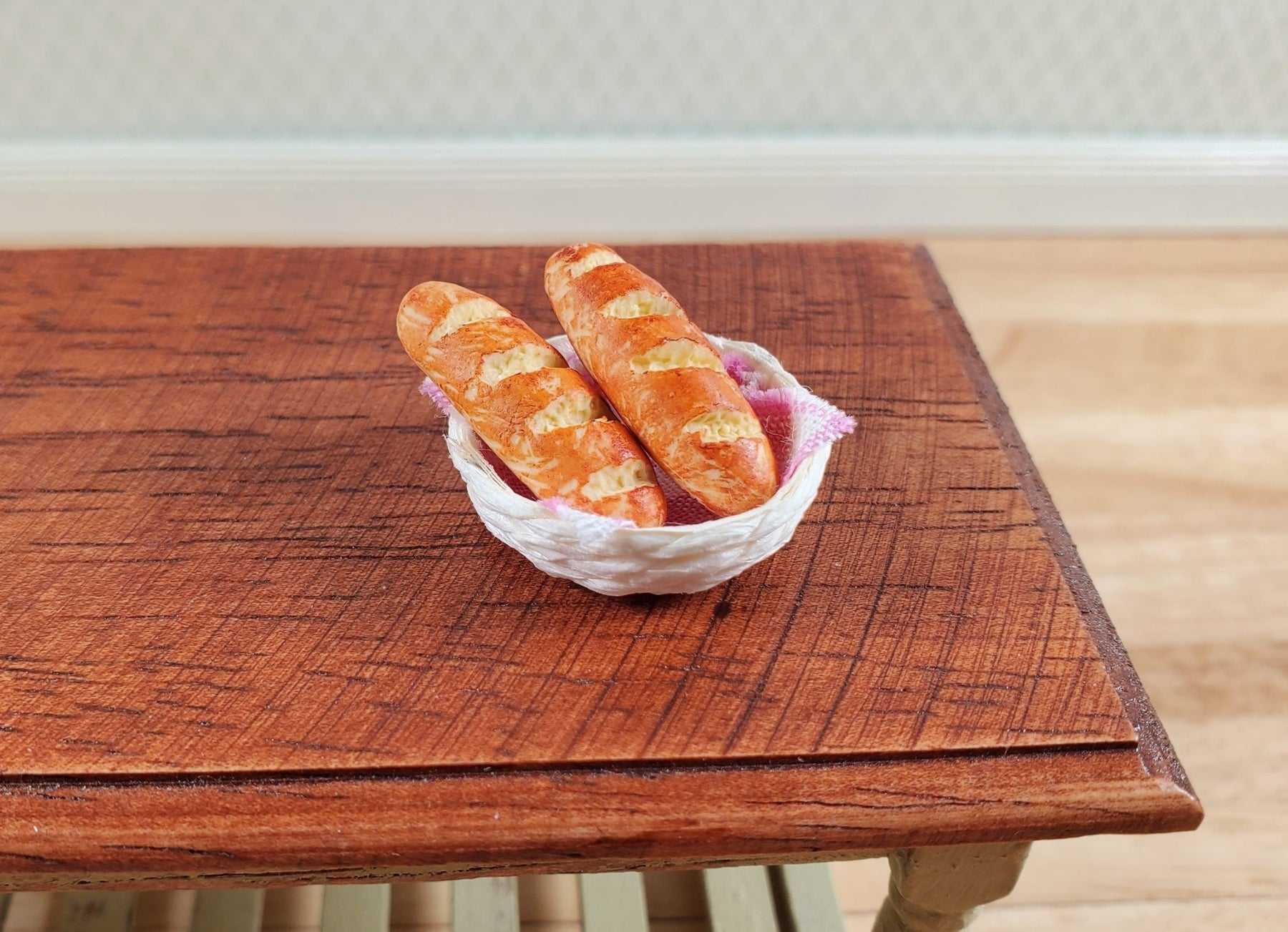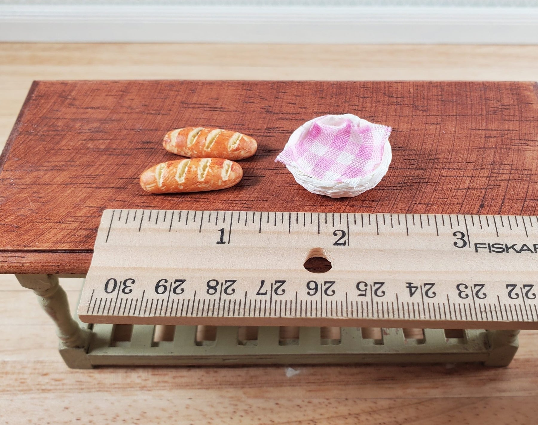 Dollhouse 2 Loaves of Bread in a White Basket with Pink Gingham 1:12 Scale