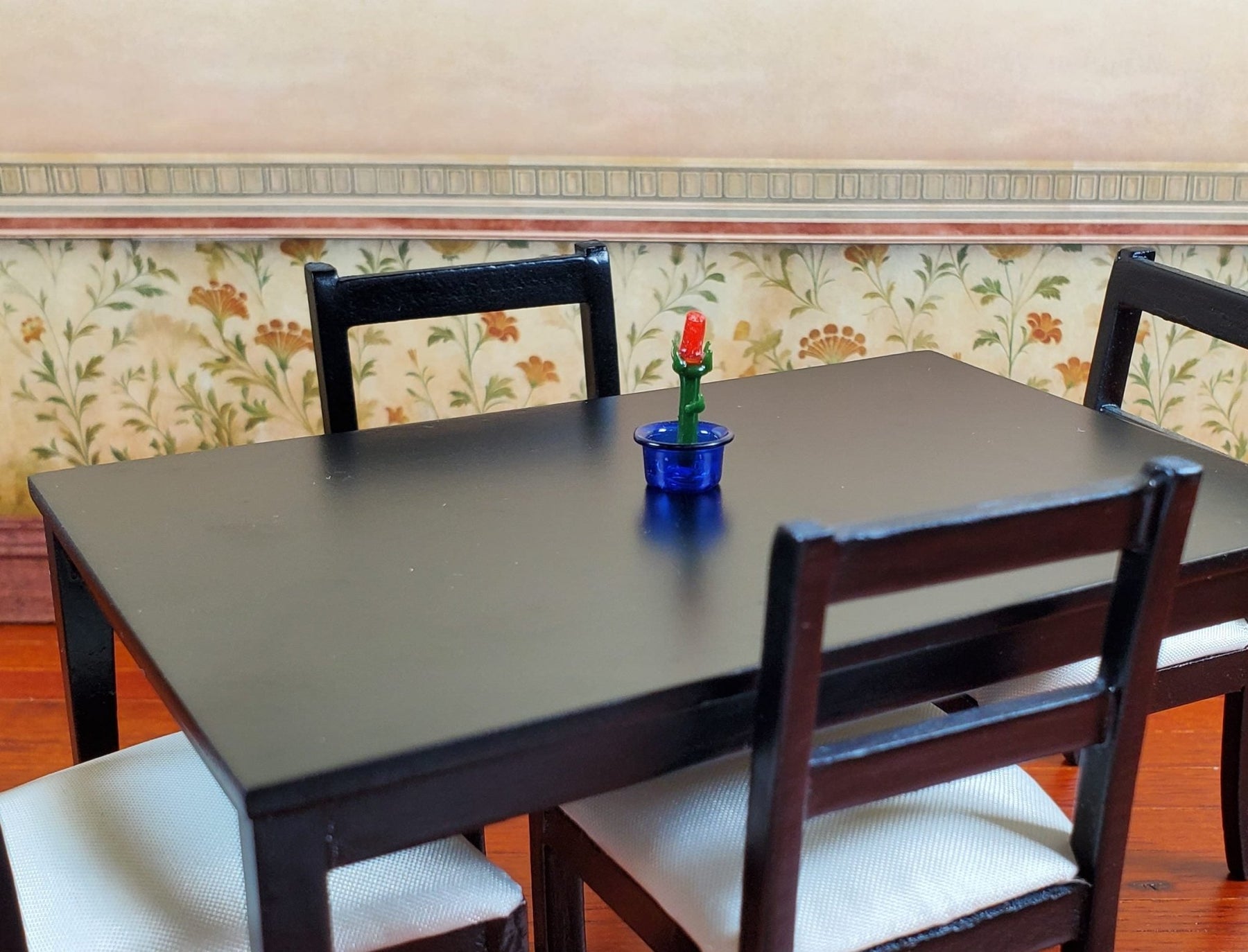 1:12 Scale Dollhouse Miniature unbelievably detailed glass rose centerpiece sculpture; red rose with green leaves in a cobalt blue bowl