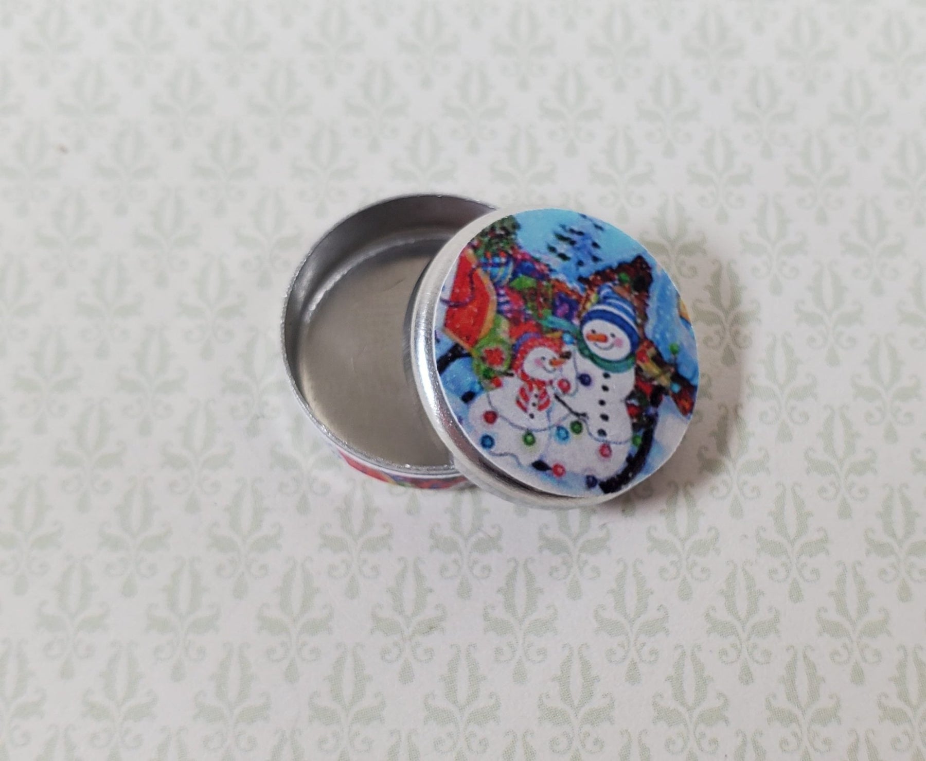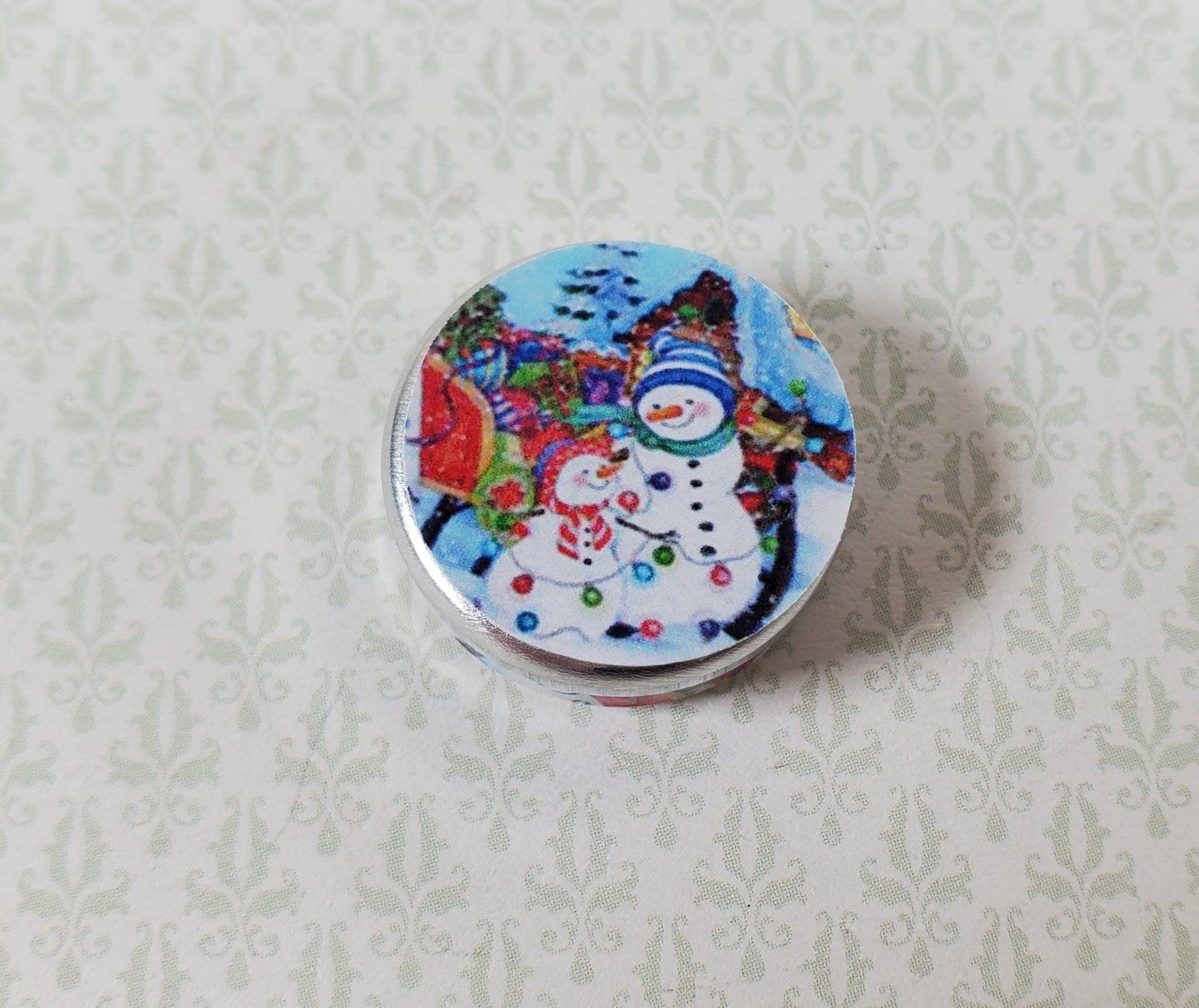 1:12 Scale Dollhouse Miniature tiny metal round cookie tin with snowmen (empty)