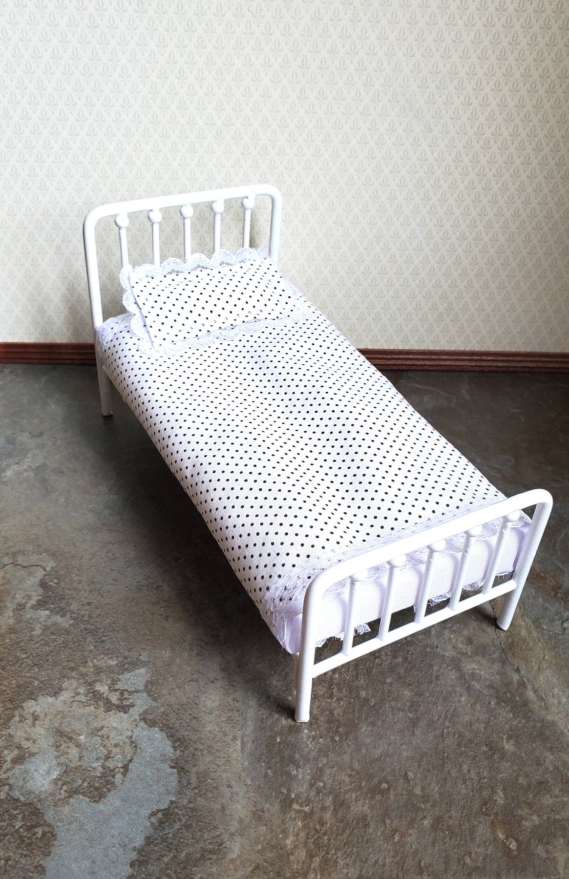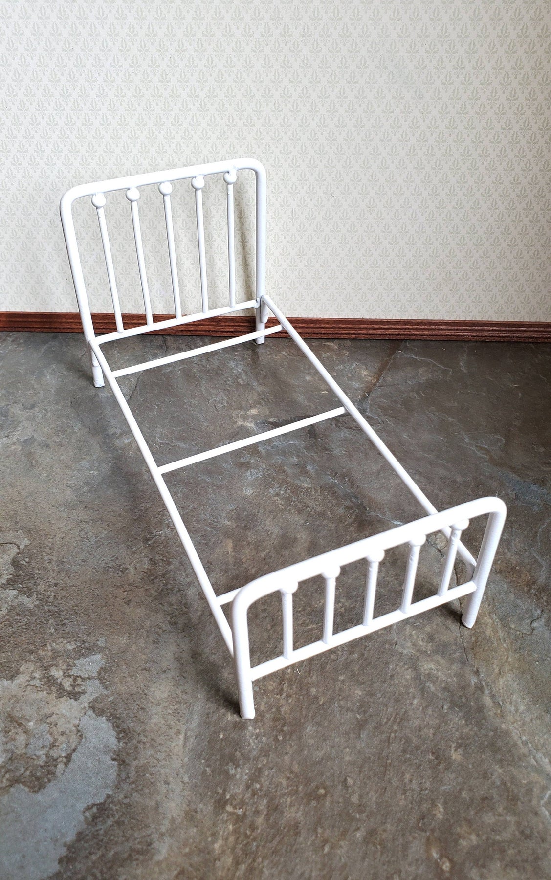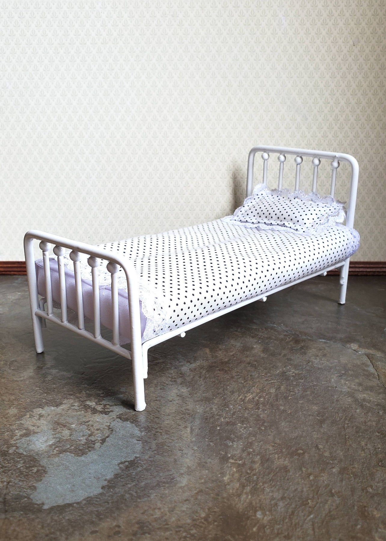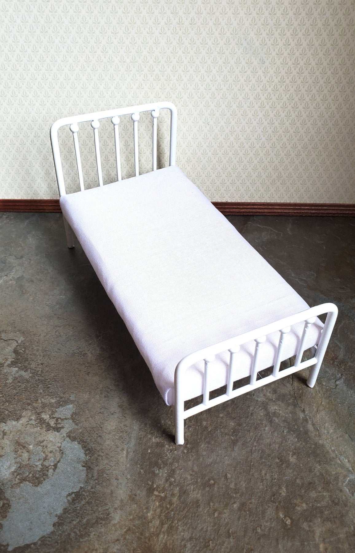 Twin size white metal bed for the dollhouse bedroom