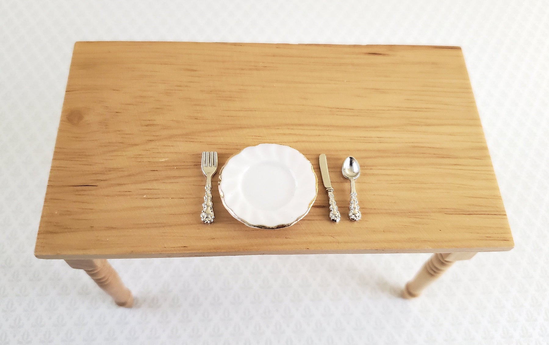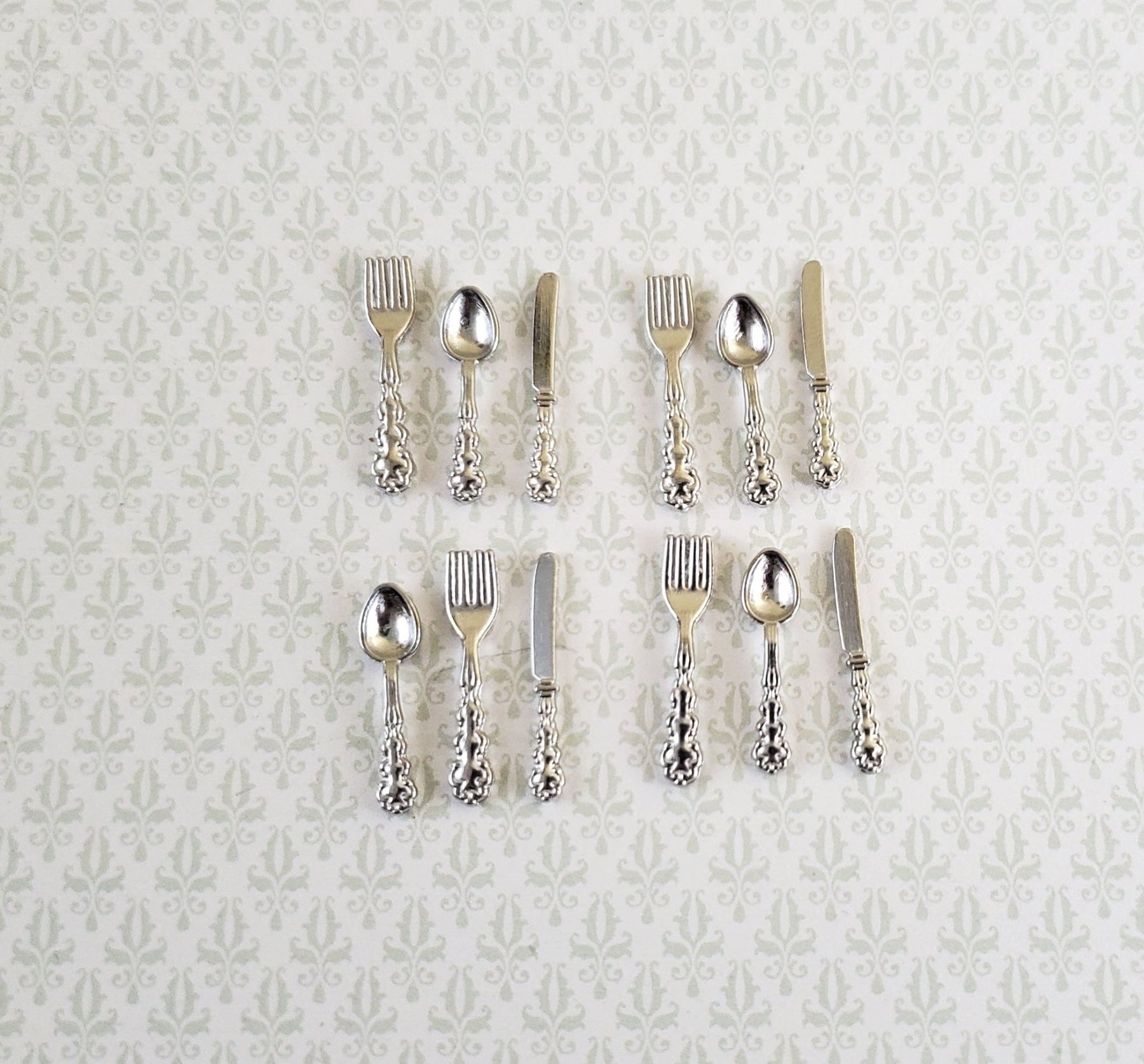 4 place settings include: 4 Forks 4 Knives 4 Spoons All pieces are approx. 3/4" (19 mm) the spoon is slightly shorter Pieces are made of metal