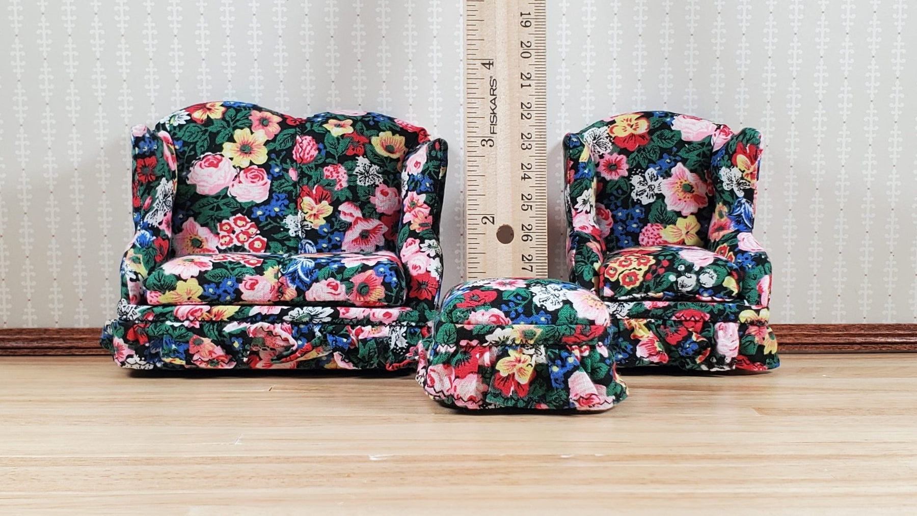 Dollhouse Small Sofa Chair Ottoman Colorful Floral 1:12 Scale Miniature Furniture - MiniatureCrush